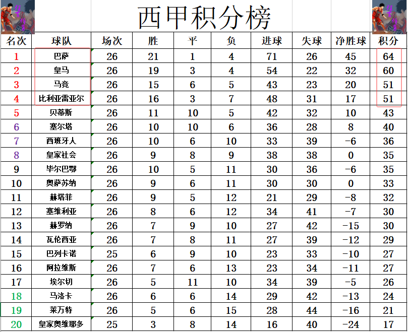 射手榜方面,伤缺的姆巴佩还是23球领跑,穆里奇16球排在第2,亚马尔13球第3,托雷斯,布迪米尔12球并列第4。维尼修斯今天错失超级单刀,还是和莫里罗,索尔洛特,瓦纳特9球刚好挤入前十。